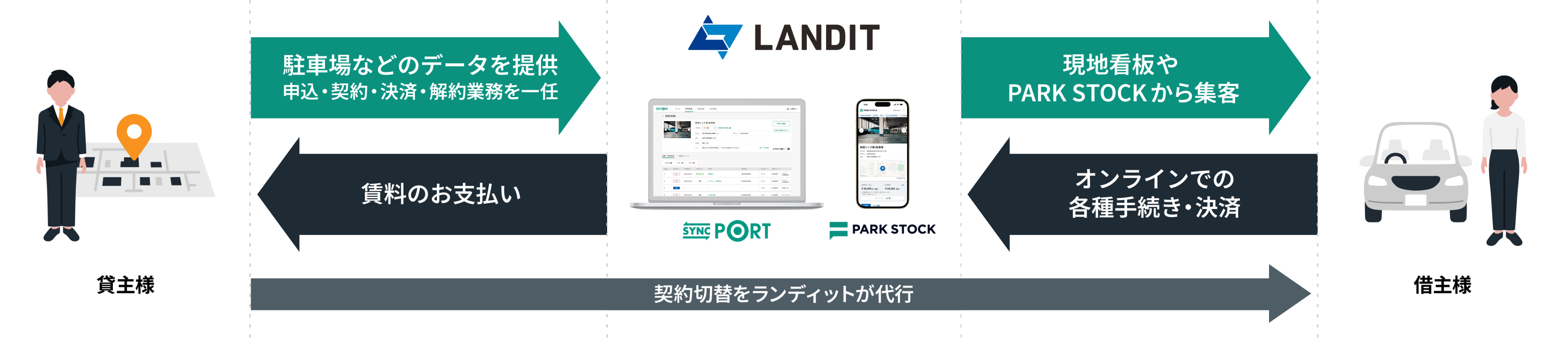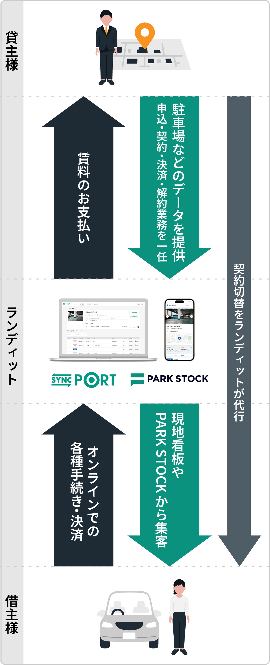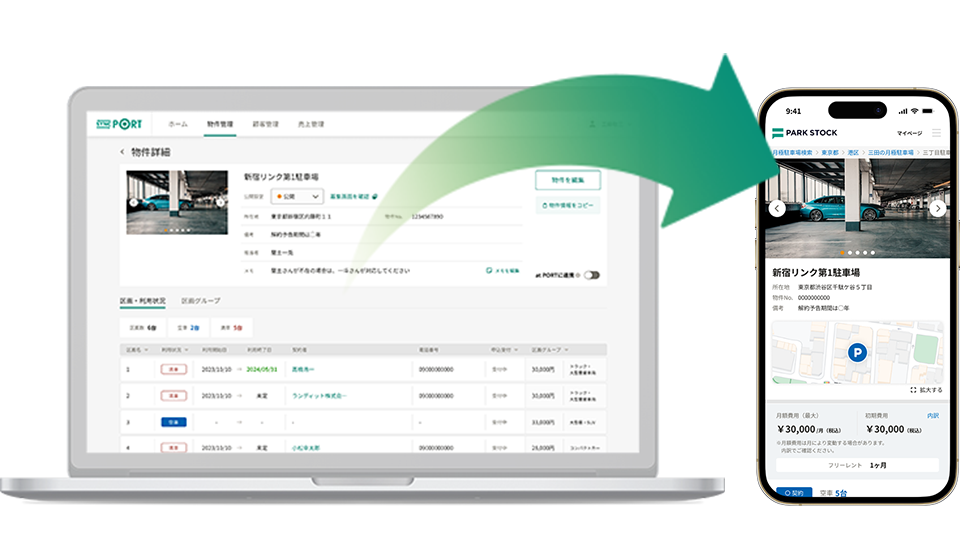 「SYNC PORT」に物件情報を登録するだけで、駐車場ポータルサイト「PARK STOCK」に駐車場情報を掲載できます。インターネットで駐車場を検索している人に直接駐車場情報を提供して集客をスムーズに行うことができます。